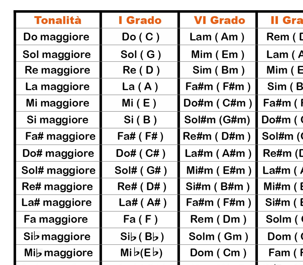 Ecco una tabella degli accordi musicali in notazione anglosassone, con le corrispondenze tra le note italiane e quelle anglosassoni.